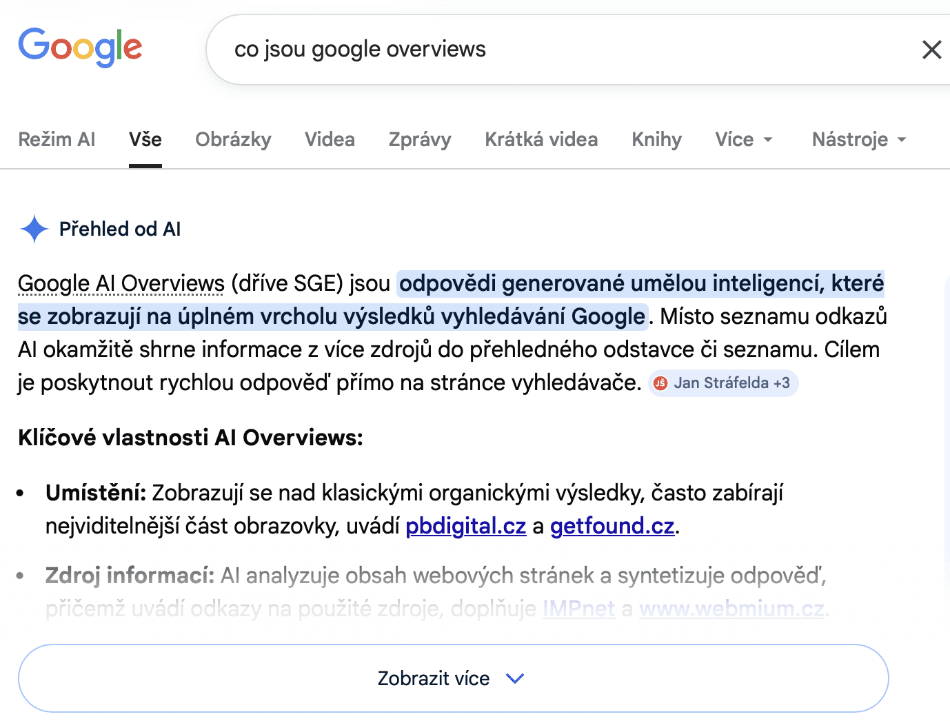 Funkce Googlu, která nad klasickými modrými odkazy zobrazí ucelenou odpověď. Vyhledávač ji sám sestaví pomocí AI na základě informací z těch nejrelevantnějších webů.